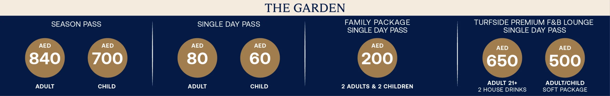This season, The Garden returns as the most refined way to enjoy the races. Surrounded by lush views and vibrant energy, guests can enjoy live entertainment, gourmet food kiosks, elevated private dining, fashion moments, kids' play zones, and stylish competitions — all from the most scenic vantage point on the track. A full-sensory experience where the racetrack meets the runway.